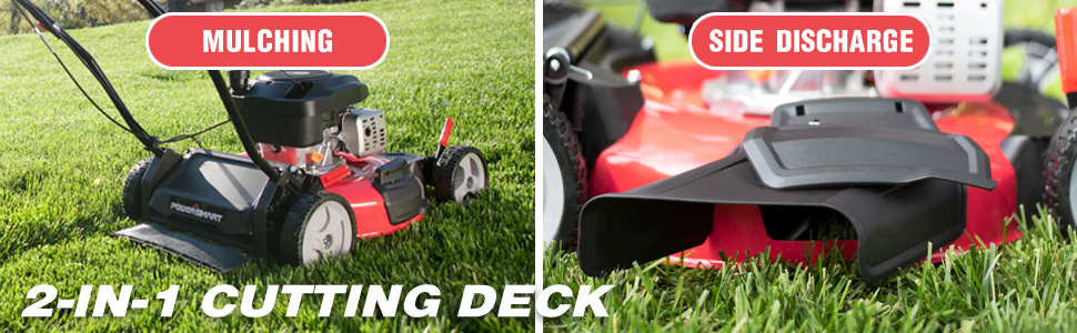- 2 in 1 Mower: mulching with heavy-duty blade minces grass into super-fine bits for recycle, side-discharge easily pass thick grass for quick mowing.
