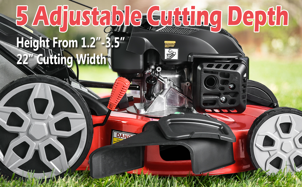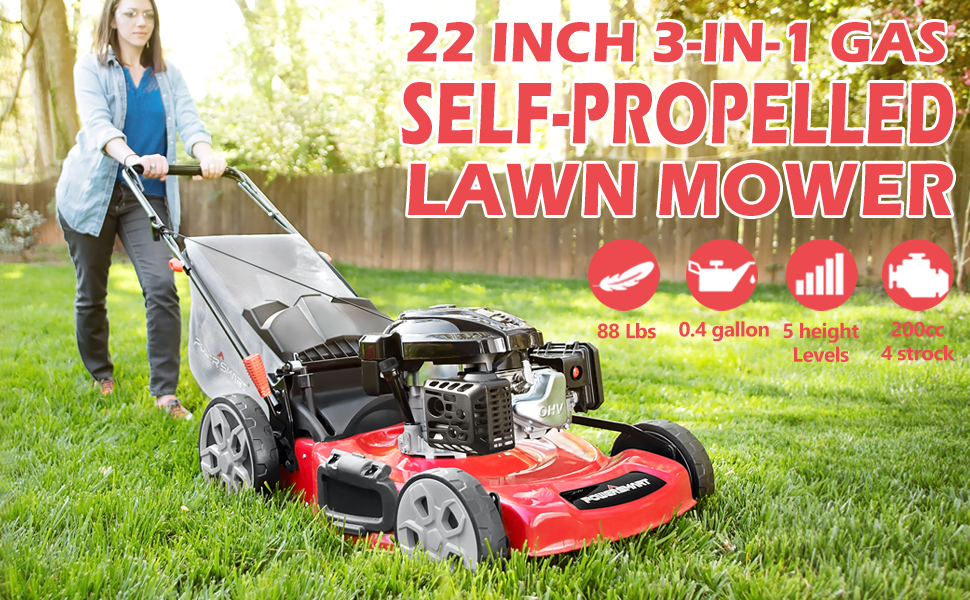 PowerSmart Self Propelled Lawn Mower, 22 Inch Lawn Mower Self-propelled, 200CC 4-Stroke Engine, 3 in 1 Gas Lawn Mower with Bag, 5 Cutting Heights Adjustable (1.2''-3.5'')